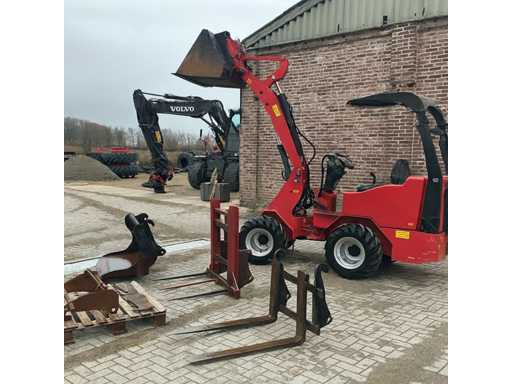 Voorzien van: Macks 333 compacte, 3-cilinder Perkins dieselmotor (33 pk/24,4 kW), hydrostatische aandrijving, 3500 kg, vierwielaandrijving, joystick bediening, geveerde bestuurdersstoel, rolbeugel, hydraulische snelwissel, pallet lepels 1000mm, schepbak, hooiriek, 2 losse adapter platen, adapter naar euro, trekhaak, werklampen, puinbak 1350mm met inlegplaat, lepels 1000mm, opname tussen de oren 720mm, hoh 415mm.