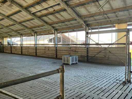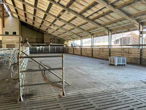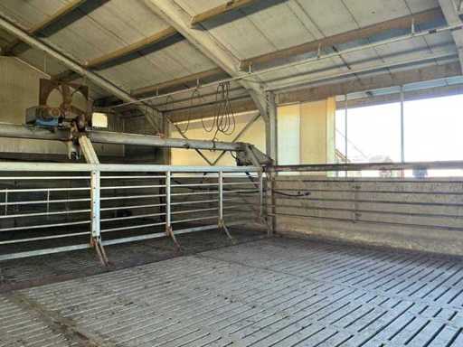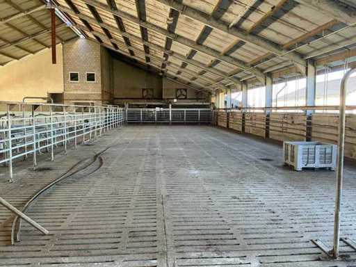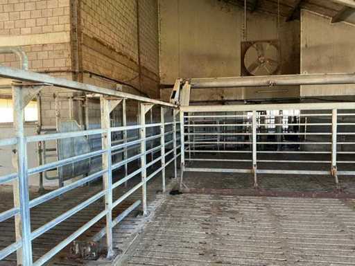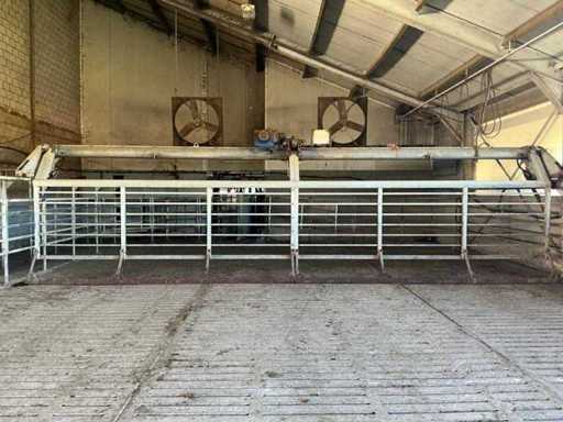 Bestaat uit: opdrijfhek 10200 breed, hoogte 1900mm, rubber strip onderzijde voor mestafvoer, elektrisch aangedreven, hoogte railbaan 1960mm, een zijde op gegalvaniseerde poten met schetsplaat, een zijde montage aan spanten, doorloop hoogte onder rek omhoog 2000mm, 2 bedienings kasten, sectie hekken op poten 1500mm h.o.h., totaal lengte 36200mm, reeds gedemonteerd,
