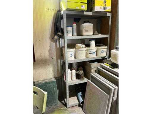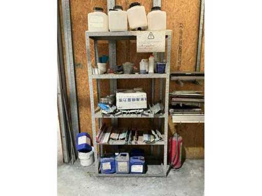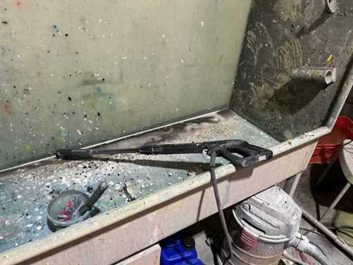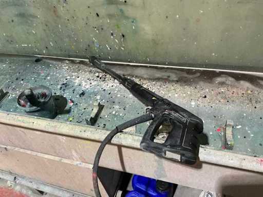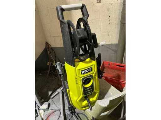Voorzien van opvangbak, compleet met hogedrukreiniger Ryobi RY140PWA, bouwstofzuiger, 2 rekken met inhoud ( verftoebehoren en toebehoren voor zeefdrukmachine)