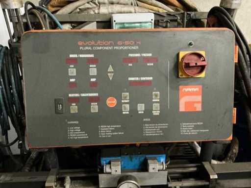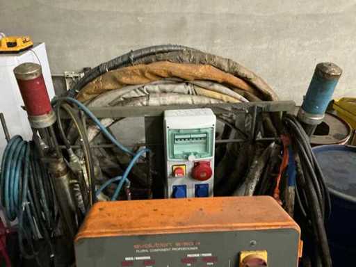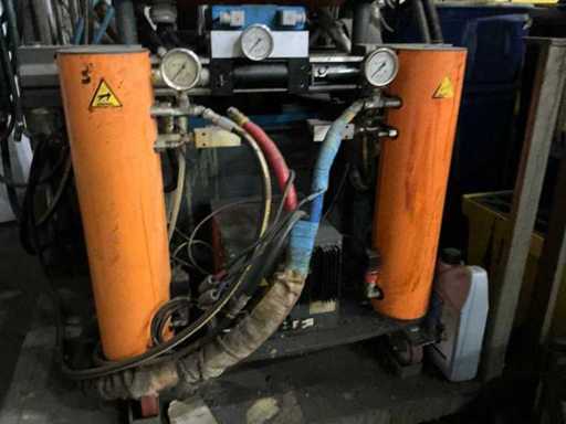 Machine met weinig draaiuren, staat al geruime tijd stil. Slangen te reinigen of te vervangen, slangverwarming werkt. Machine werkt, pompen ook.