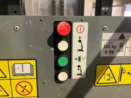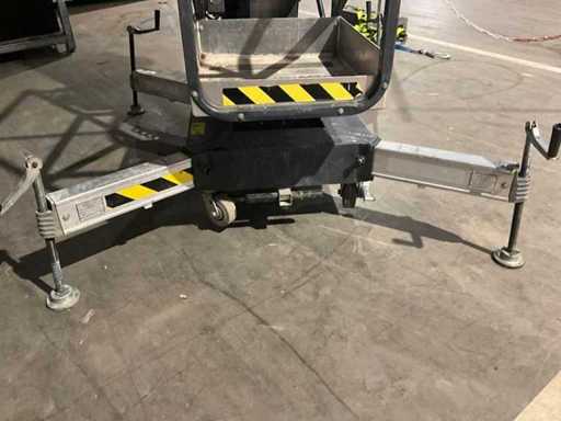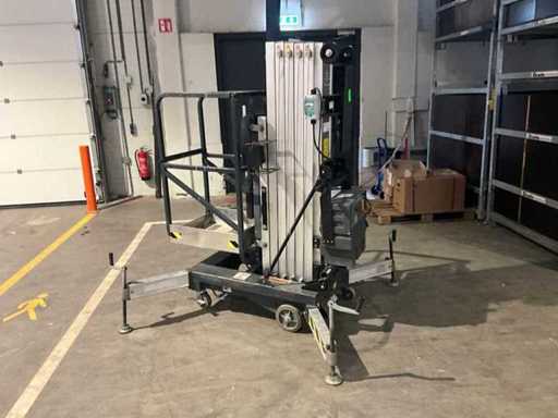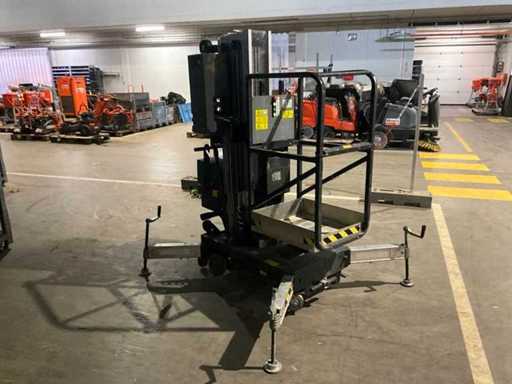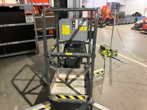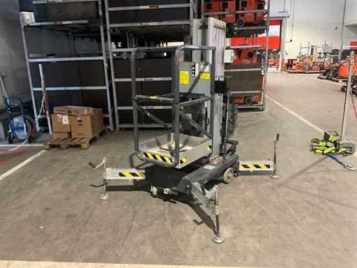 compacte personenlift; voorzien van 4 regelbare steunvoeten; toepassing: onderhoud / service / montagewerkzaamheden; uitvoering: staal / aluminium; verrijdbaar; 230 Volt; netstroom; 12 Volt accu; geen urenstand aflezing aanwezig; working condition;