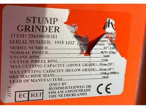 N=3600 / minuut; benzinemotor; verwijdert in de grond achtergebleven boomstronken tot 510 mm boven bodemniveau en 410 mm onder bodemniveau; not working;