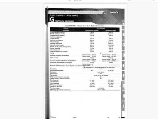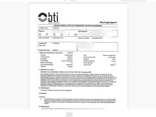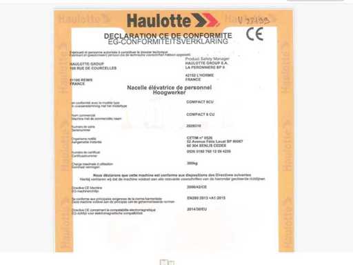 Type: Schaarhoogwerker Merk: Haulotte Model / type: Compact 8 CU Commerciële naam: Compact 8 CU Serienummer: 2029310 Bouwjaar: 2018 CE-conformiteit: ? aanwezig CE-verklaring: Haulotte Group Notified body: CETIM n°0526 (Frankrijk) Certificaatnummer: 0526 5180 760 12 09 4250 Aandrijving & techniek Aandrijving: Elektrisch Accu: ? aanwezig (elektrische tractiebatterij) Hefmechanisme: Hydraulisch Chassis: op 4 banden Rijaandrijving: elektrisch Capaciteit & gebruik (CE + keuring) Max. werkhoogte: 8,0 m Platformhoogte: 6,0 m Platformcapaciteit: 300 kg Aantal personen: 2 Gebruik: binnen & buiten (vlak terrein) Afmetingen & platform (standaard Compact 8 CU – fabrieksspecificatie) Platformafmetingen: ± 2,31 × 0,81 m Uitschuifplatform: ? ja (± 0,90 m) Totale lengte: ± 2,31 m Totale breedte: ± 0,81 m Totale hoogte (ingeklapt): ± 2,05 m Gewicht & mobiliteit Eigen gewicht: ± 1.980 kg Max. helling: ± 23 % Bandentype: massief (industriële banden) Keuring (BTI – België) Keuringsinstantie: BTI Datum onderzoek: 22/12/2017 Datum verslag: 22/12/2017 Resultaat: ? Goedgekeurd