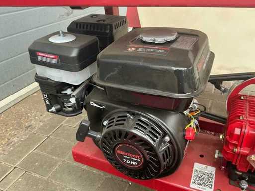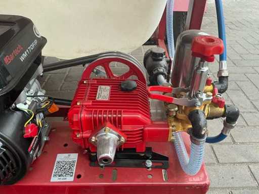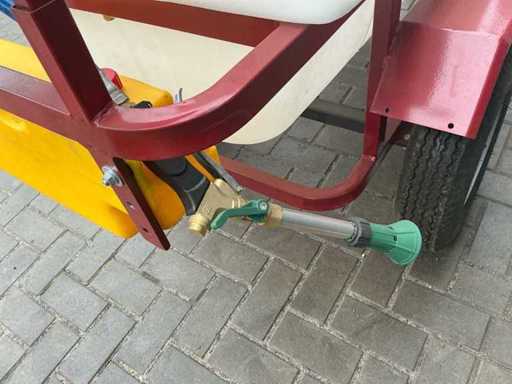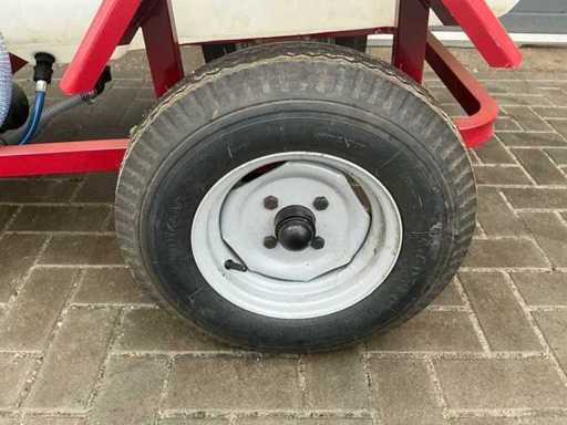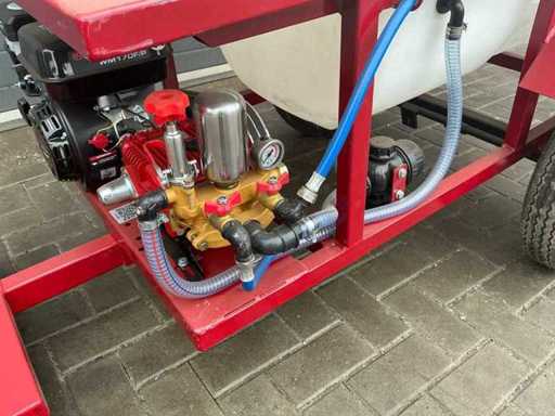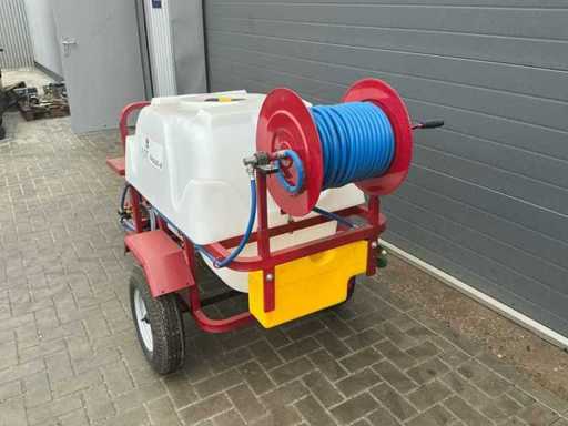 Voorzien van: 7 pk benzine motor, koordstart, HD pomp Os-22B3N, druk 0-40 kg/cm², zuigvolume 13,5-20 l/min, toerental 800-1200 tpm, luchtbanden 4.50-10, slanghaspel, spuitslang, schoonwatertank met kraan, tankinhoud 400Ltr, dissel met draaibare aankoppeling, pen 20mm,