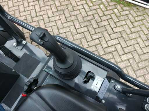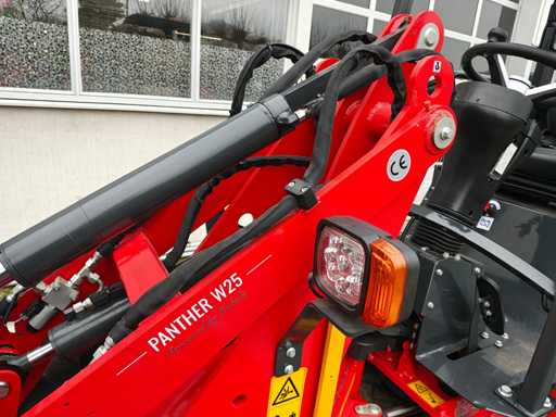 Specificaties Panther W25 Miniloader, ongebruikt Engine Kubota V1505 4 cilinder diesel, watergekoeld Power 18,4KW / 25pk 1,498L max 3000 t/min Pump(single), Rexroth plunger pump Flow: 78LPM Work Pressure:32MPa Hydraulic Motor Single(Rexroth) Valve Walvoil (Italy) Double floating High – low speed Top speed :20 km/h(Electronic Control) Electric handle ①Forward and Back buttons ②High and low speed Turn signal LED work lights Seats Toyota Seat, Safety shut-off sensor(20s)(Start the neutral switch and parking brake switch) Accessories Quick coupler (EU hydraulic) bucket :0.28cbm Tire 31.5×15-15.5 Rated lifting capacity 850-1250kg Hydraulic oil tank 32L Fuel tank 30L Traction 15 kN Machine weight 2570 kg Packing size 3000*1500*2200mm (without bucket)