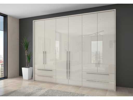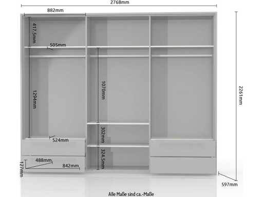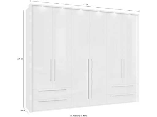 Geniet van ruime opbergruimte met een hoogte van 226 cm en een breedte van 277 cm. De planken en kledingrekken zijn individueel op hoogte verstelbaar. Zeer hoogwaardige, gebruiksvriendelijke en krasbestendige ondergrond dankzij een hoogglans UV-vernis. Met in hoogte verstelbare voeten om oneffenheden in het terrein te compenseren. Zacht-dicht functie voor een stille en zachte deur die sluit. Gemaakt van FSC-gecertificeerde houtgebaseerde materialen, gemaakt in Europa