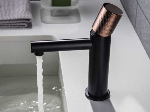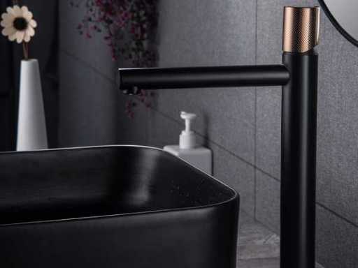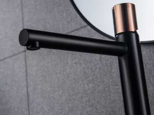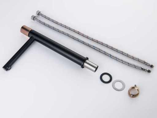 mengkraan met keramisch binnenwerk, materiaal messing, kleur mat zwart met goud, hoogte 19 cm,voorzien van waterslangen met aansluitmateriaal