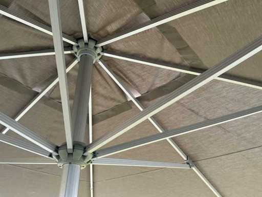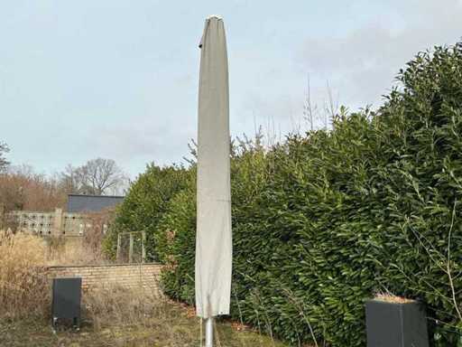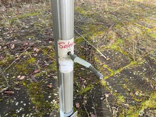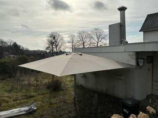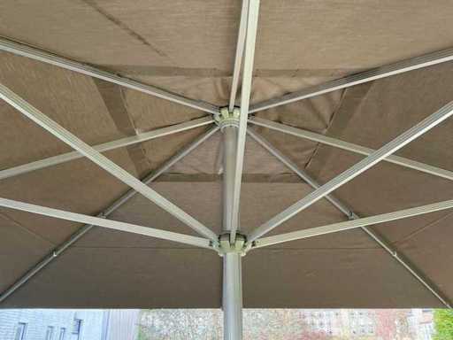 Voorzien van: 2 professionele terrasparasols van het merk Solero, 5Mtrx5Mtr, geschikt voor gebruik in horeca, evenementen of particuliere buitenruimtes, aluminium frame en een doek in neutrale beige/taupe kleur, centrale mast met handslinger voor het openen en sluiten, gemonteerd op vaste stalen voetplaten, geschikt voor verankering op een vaste ondergrond, inclusief bijbehorende beschermhoezen, inclusief handslingers, uitschuifbare stok om beschermhoes te plaatsen, geschikt voor terras of horecagebruik, onderloop hoogte 2200mm, ingeklapt 5000mm lang, met hoes, betreft 2 stuks, inclusief handels en schuifstok.