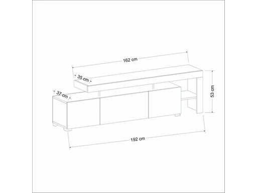 Het tv-meubel is 162 cm breed, 53 cm hoog en 35 cm diep.