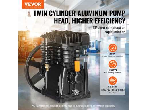 3 PK luchtcompressor pompkop: VEVOR 3 PK tweecilinder luchtcompressor pompkop heeft 5,8 CFM luchtstroom bij 90 PSI en een maximale werkdruk van 116 PSI, zorgt voor een continue en voldoende luchttoevoer voor een breed scala aan apparatuur, ideaal voor bandenoppompen, spuiten, houtbewerking en andere taken. (OPMERKING: Motor niet inbegrepen).