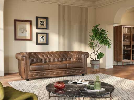 Kenmerken Kleur (schaduw): Bruin Materiaal: 100% polyester, microvezel Materiaal (basis): Hout Structuur: Hout, Multiplex Afdronk: getuft, gerijpt Soort model: Chesterfield Aantal zitplaatsen: 3 zitplaatsen Opties: Afneembare hoes Verwijderbaar onderdeel : Zitting Vulling zitting: Polyurethaanschuim Dichtheid zitting: 25 kg/m³ Stoelvering: Gekruiste elastische banden, Schroefveren Vulling rugleuning: Polyurethaanschuim Dichtheid rugleuning: 22 kg/m³ Ophanging van de rugleuning: in elkaar grijpende elastische banden Met armleuningen Maximale ondersteunde belasting: 360 kg Gemonteerd geleverd (behalve voeten en/of handgrepen) Grootte Lengte: 205 cm Hoogte: 72 cm Diepte: 88 cm Zithoogte: 42 cm Diepte zitting: 62 cm