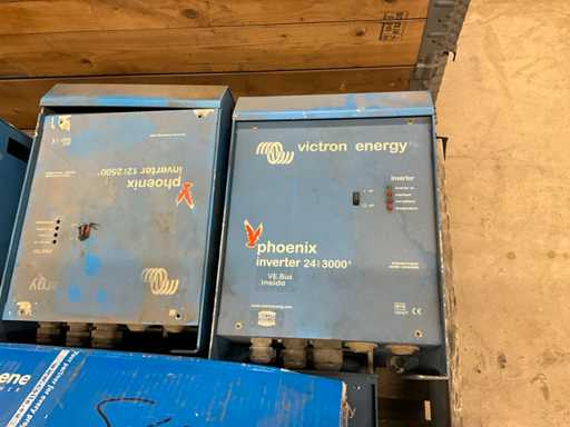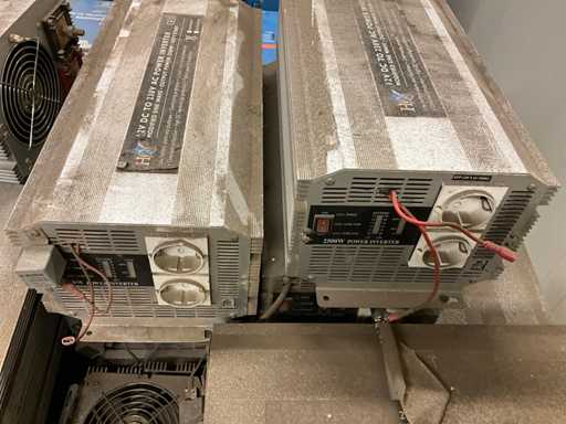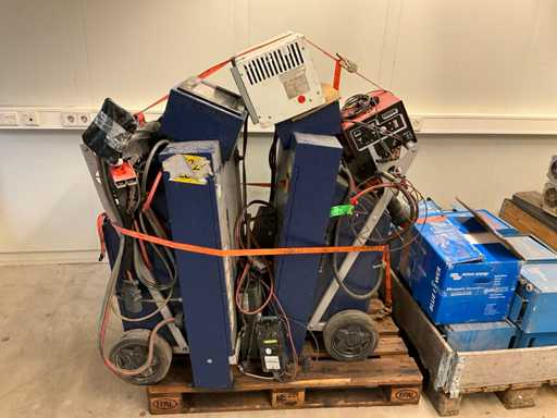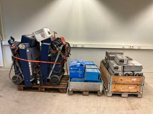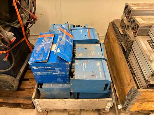 1x pallet gebruikte omvormers 12V naar 230V, 1x pallet met gebruikte laders 24V, 1x pallet 2 grote 380V laders en diverse kleinere laders
