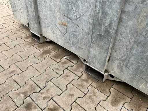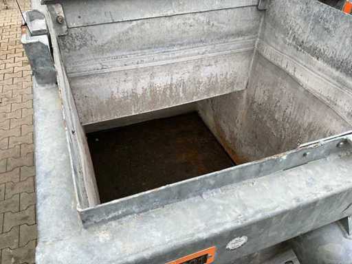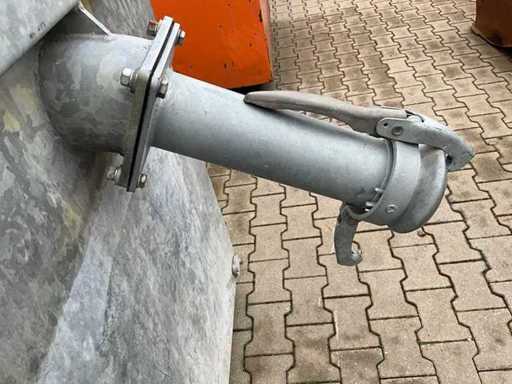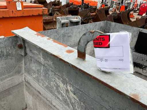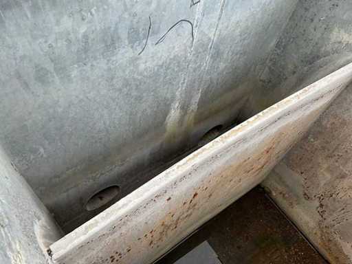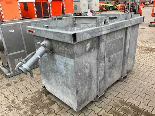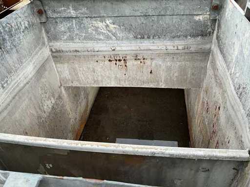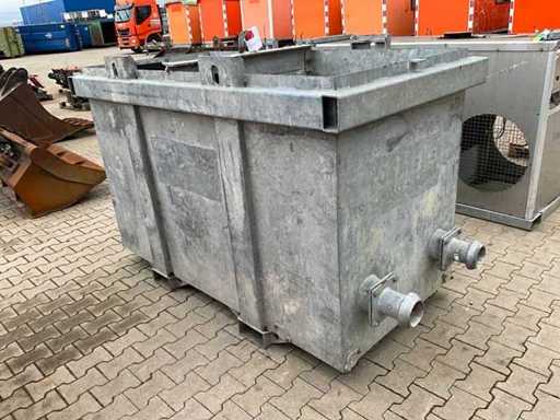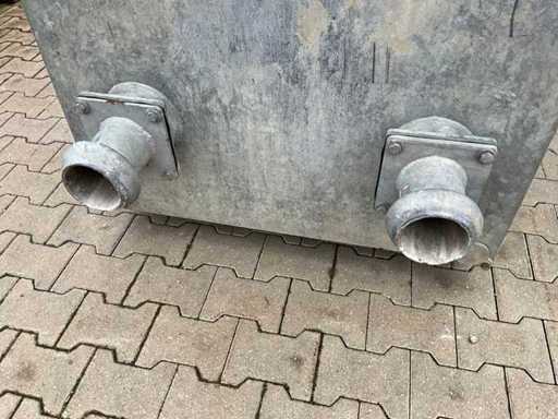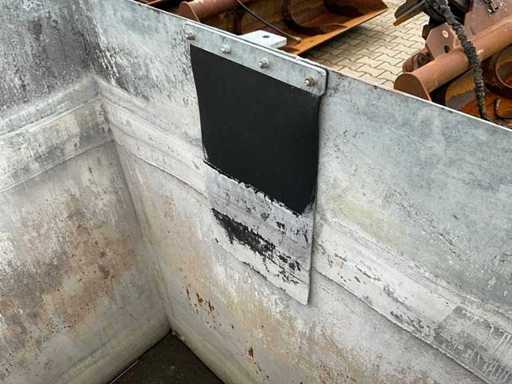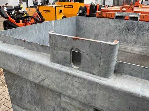 gegalvaniseerd staal; heftruck vorksleuven; 2x 4” Perrot koppeling in, bad 900 mm diep, uitvoer 4” Perrot koppeling, lepelgaten, 4x hijsoog;