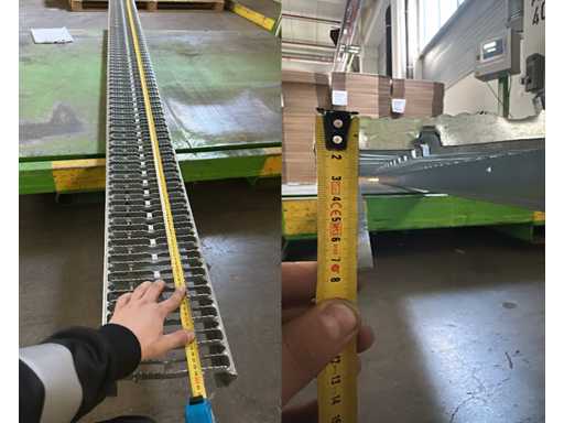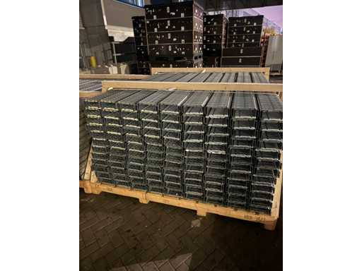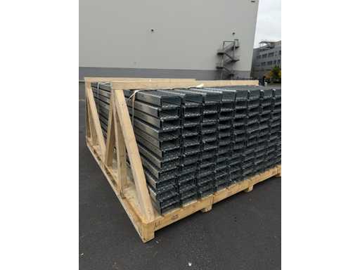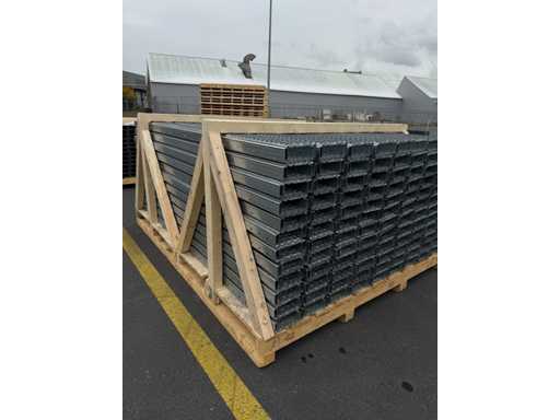 De panelen liggen netjes gerangschikt op een houten pallet, klaar voor installatie of transport. Deze elementen worden meestal gebruikt als dragende componenten in mezzanines, fabrieksvloeren of verhoogde platforms, en bieden een sterke en duurzame ondersteuning voor zware industriële toepassingen. Op de achtergrond zijn verschillende grote transportkisten te zien in een magazijnomgeving.