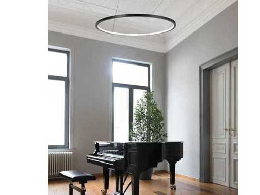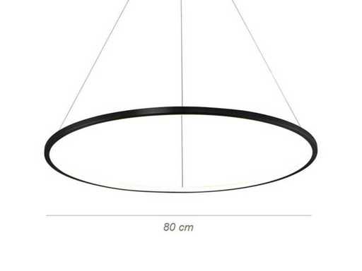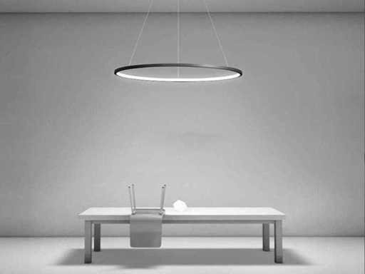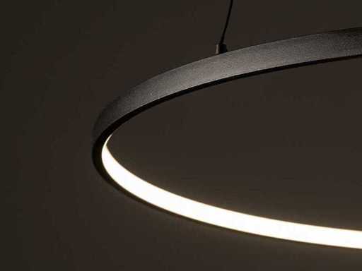 Aurora 80 design armatuur zwart, geschikt voor ontvangstruimten, vergaderplekken, werkkamers of de showroom, maar ook in de woonkamer, vide of andere woon en werk ruimtes. Bestaat uit draai- en kantelbare ringen welke voorzien zijn van een opalen warm witte led lichtbron. Dankzij de flexibele hoogte verstelling is het mogelijk om de ringen snel en eenvoudig afzonderlijk van elkaar te kantelen of te verstellen. Aantal lichtbronnen: 1. Afmeting p stuk ca.: 80 cm x 100 cm Kardanisch verstelbaar: Ja. Lichtbundel ca 110 graden. Lichtkleur: Warm wit. Aansluiting: 230 Volt. Kleur: Zwart mat Lotwaarde: € 946,- Bijzonderheden: Dit betreft een nieuw product.