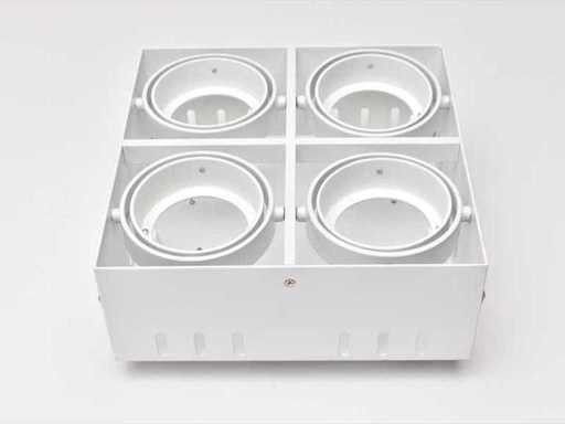 Ledsc4 Quad Multidir in trimless armatuur wit randloze design inbouw spots, geschikt voor kantoor, winkel, showroom, ontvangstruimten, ook in woonkamer, de keuken, in slaapkamers, inloopkasten. Kardanisch kantelbaar en in hoogte verstelbaar, dimbaar, geschikt voor led en halogeen lampen. Merk: ledsc4, Type: DM-0096-14-00, Minigrid in trimless, Afmeting ca.: 21.4 x 21.4 x 8 cm. Max aantal lichtbronnen: 4. Kardanisch verstelbaar: Ja. Dimbaar: Ja. Inclusief inbouwframe: Ja. Kleur: Wit