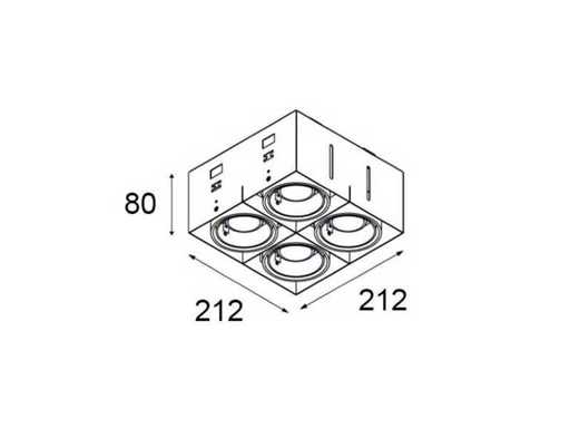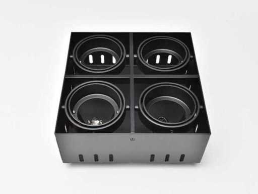 Ledsc4 Quad Minigrid in trimless armatuur zwart, randloze design inbouw spots, geschikt voor kantoor, winkel, showroom, ontvangstruimten, ook in woonkamer, de keuken, in slaapkamers, inloopkasten. Kardanisch kantelbaar en in hoogte verstelbaar, dimbaar, geschikt voor led en halogeen lampen. Merk: ledsc4, Type: DM-0096-60-00, Minigrid in trimless, Afmeting ca.: 21.4 x 21.4 x 8 cm. Max aantal lichtbronnen: 4. Kardanisch verstelbaar: Ja. Dimbaar: Ja. Inclusief inbouwframe: Ja. Kleur: Zwart Lotwaarde € 448,-.