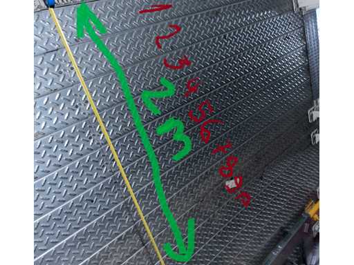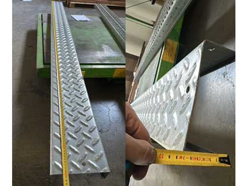 De panelen liggen netjes gerangschikt op een houten pallet, klaar voor installatie of transport. Deze elementen worden meestal gebruikt als dragende componenten in mezzanines, fabrieksvloeren of verhoogde platforms, en bieden een sterke en duurzame ondersteuning voor zware industriële toepassingen. Op de achtergrond zijn verschillende grote transportkisten te zien in een magazijnomgeving.