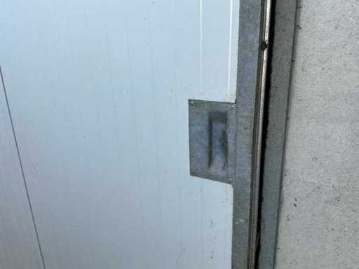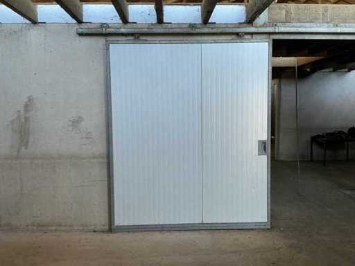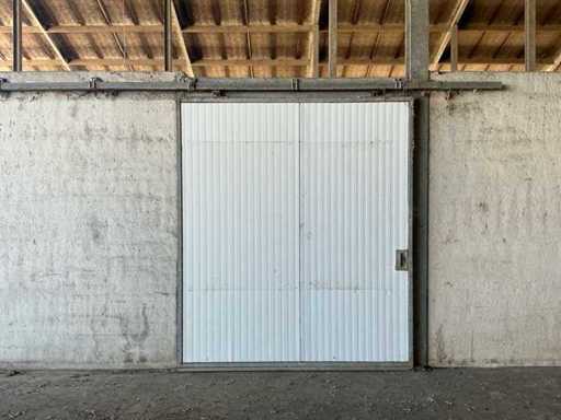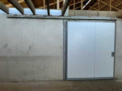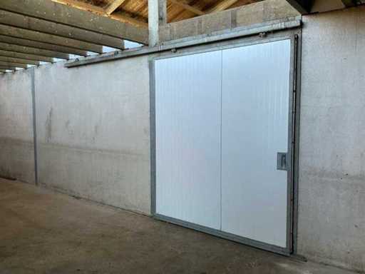 Bestaat uit: 6 stuks schuifdeur 2100mm breed, 2500mm hoog, 60mm dik, gegalvaniseerde omlijsting, tochtborstels, geleiders, rail 4500mm, handgreep binnen en buiten zijde, 2 stuks onder geleider per deur, 15mtr rail bij foto’s met 3 deuren, 60 millimeter dikke sandwichpanelen die in een stalen gegalvaniseerde omranding zijn geplaatst, brandvertragende PIR-hardschuim die tevens bijdraagt aan de isolatie.