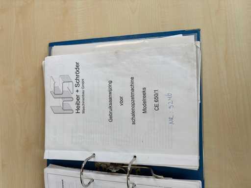 De Heiber + Schröder CE 650/1 schalenopzetmachine (bouwjaar 2000, serienummer 5246) heeft een productie snelheid tot 10.000 per uur , ondersteunt kartonformaten van ca. 200 x 200 mm tot 650 x 800 mm, verwerkt materiaal van 300–800 g/m², werkt met hotmelt lijm (meestal Nordson of Robatech), is uitgevoerd met een mechanisch vouwsysteem en persunit, heeft een elektrische aansluiting van 400V / 3-fase / 50Hz, weegt circa 1500–2000 kg en heeft afmetingen van ongeveer 3–4 meter lang en 1,5–2 meter breed.