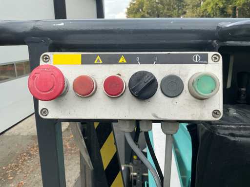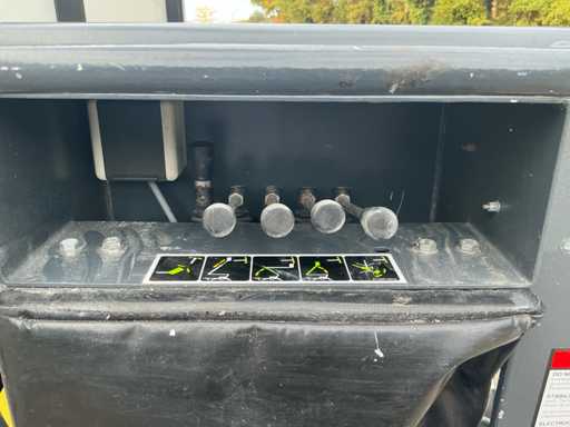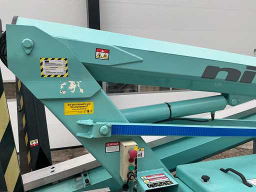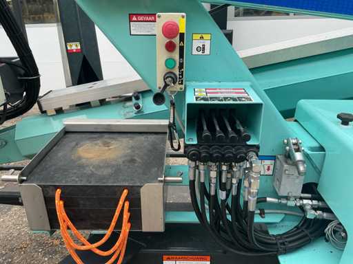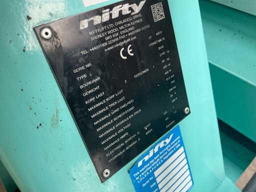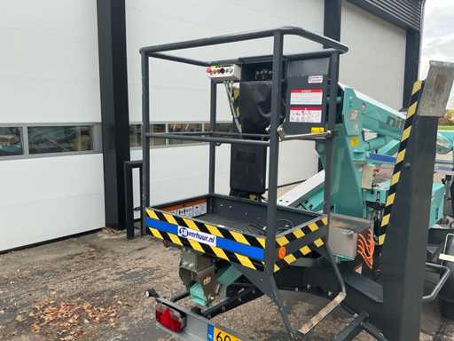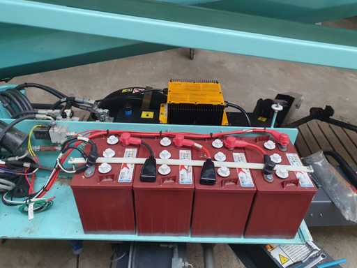 Voorzien van interne lader, nieuw accu pakket met loodzuur, September 2025 gekeurd, moovers, 24V DC (4x 6V deep cycle batterijen, totaal ± 340 Ah), Stempels (outriggers): 4 hydraulisch bedienbare stempels met waterpasindicator, Rotatie: 360° continu (niet-overlappend), Platformrotatie: 100° (handmatig of hydraulisch, afhankelijk van optie), Kenteken: 60-WT-KP, Veiligheidssystemen: Nooddaalsysteem, kantelbeveiliging, overbelastingbeveiliging.