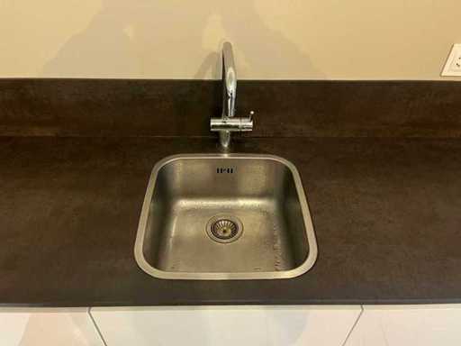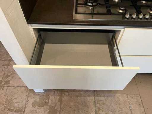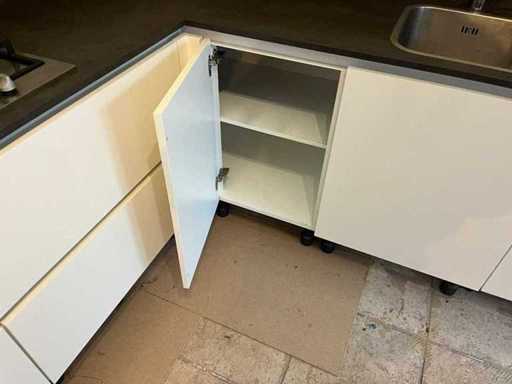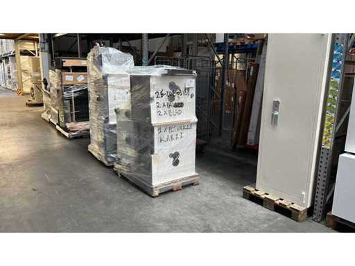 Conditie: afmetingen linkerdeel circa 224x60x90 cm; afmetingen rechterdeel circa 293x60x170 cm; reeds gedemonteerd en ingepakt op pallets. (afstapelen, omruilen of statiegeld per pallet); pallets zijn niet inbegrepen; statiegeld betalen bij afhalen, of pallets afstapelen; werkblad niet ingepakt op pallets (26-2DE-03188)