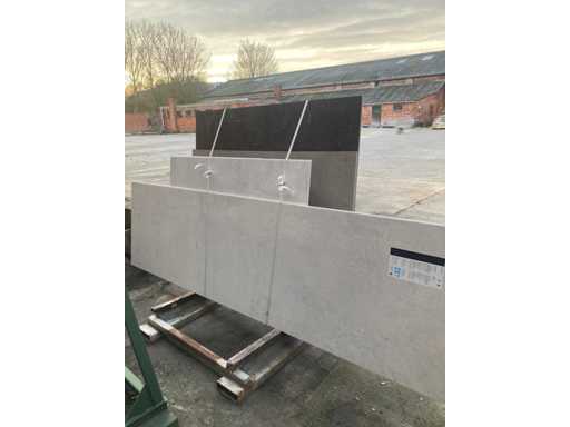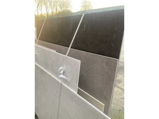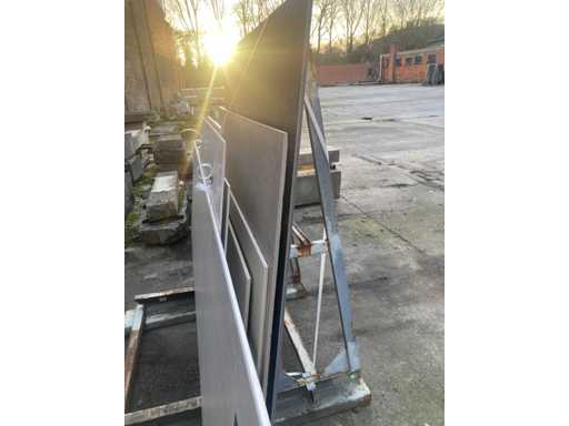 2 stuks metalen transportbokken voor vervoer met heftruck + alle ceramische en natuursteen platen op deze bokken: verschillende ceramische platen en natuursteen.