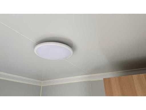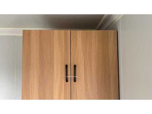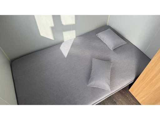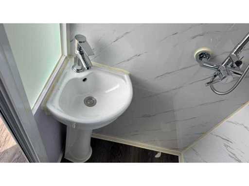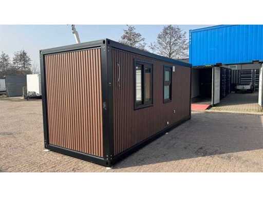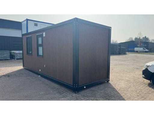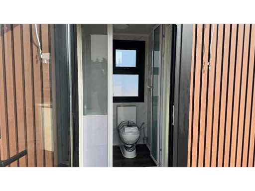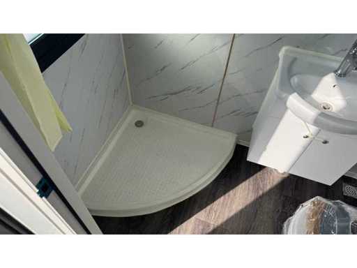 Voorzien van gevelbekleding in houtlook, badkamer met WC en douche, slaapkamer met slaapbank en kast, stroomaansluiting 230 Volt, wateraansluiting, rioolaansluiting, vinyl vloer, bordes.