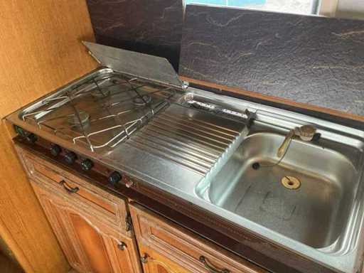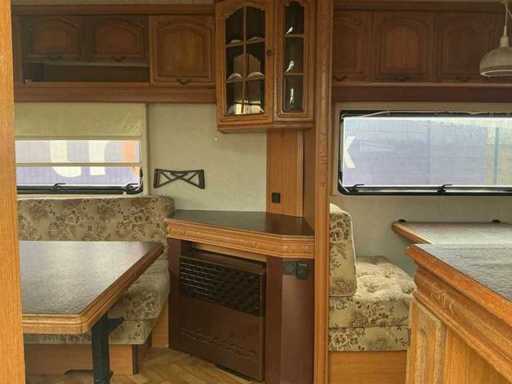 v.v. 7-polige stekker; slaapplek; zithoek, ombouw mogelijkheid tot bed; keukenblok; 3-pits gasfornuis; opbergkasten; toilet; wastafel; kachel