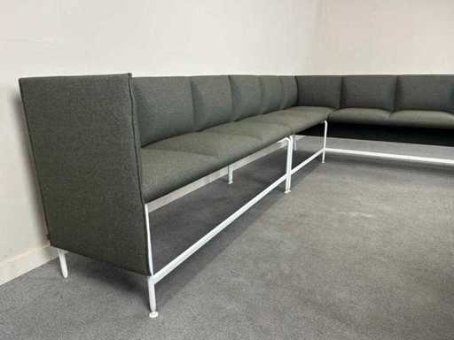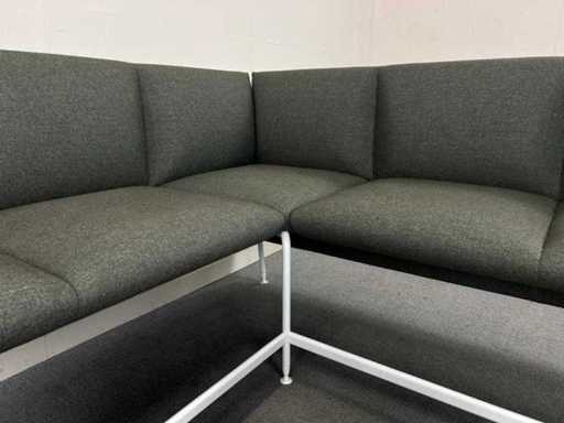 Bestaat uit meerdere vaste zitmodules in L-opstelling. Gebruikte staat met lichte gebruikssporen.