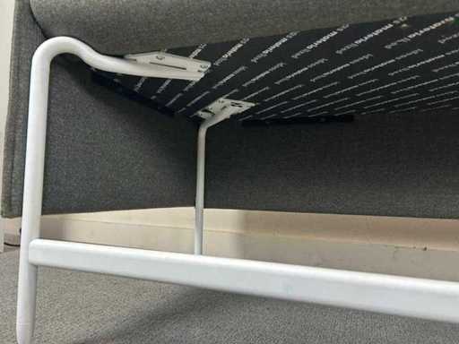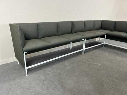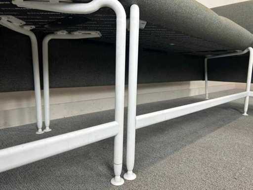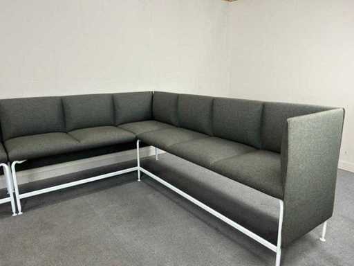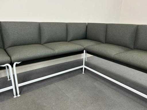 Modulaire hoekbank / zithoek, uitgevoerd in grijze stoffering met wit metalen onderstel. Strak en tijdloos ontwerp, geschikt voor ontvangst-, wacht- of kantoorruimte.