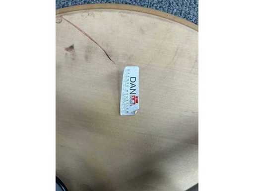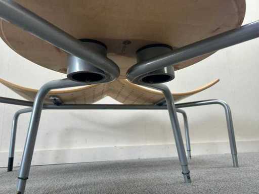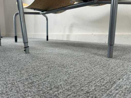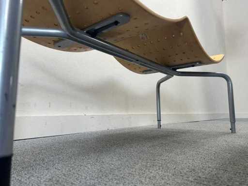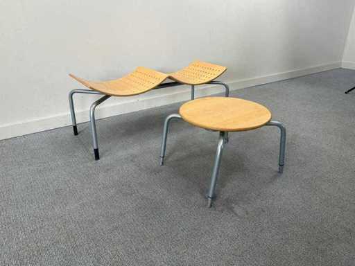 Design lounge-element bestaande uit een lage bank en bijhorende salontafel. De bank is uitgevoerd met een gebogen, geperforeerde houten zitschaal in naturel afwerking, gemonteerd op een stabiel grijs metalen buisframe. De salontafel heeft een rond houten blad in dezelfde houttint en een bijpassend metalen onderstel, wat zorgt voor een harmonieus geheel. Geschikt voor wachtruimtes, informele zithoeken of publieke ruimtes. In gebruikte staat met lichte gebruikssporen, passend bij normaal gebruik.