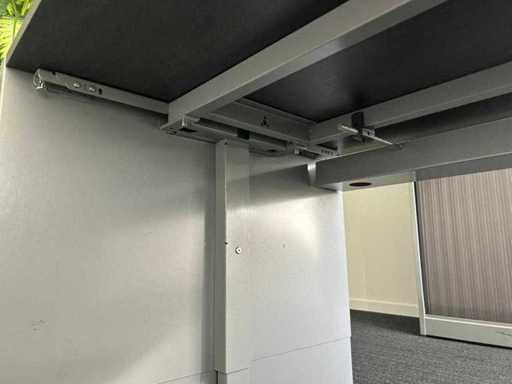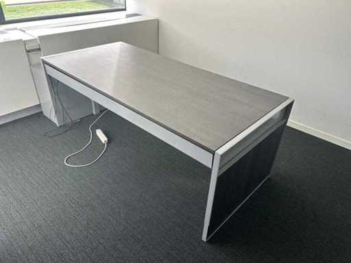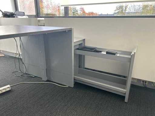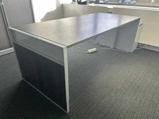 Recht bureau met zijpanelen, voorzien van een donker houten werkblad en een metalen frame. Aan één zijde uitgerust met een geïntegreerd lade-/kabelmanagementsysteem. Niet elektrisch in hoogte verstelbaar. Geschikt als werk- of vergadertafel in kantooromgeving.