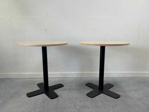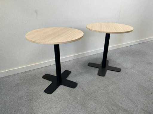 Set van ronde tafels met licht houtkleurig blad en zwart metalen voet in kruisvorm. Strak en tijdloos ontwerp, geschikt voor kantine, koffiehoek, vergaderruimte of ontvangstruimte. Stevig en stabiel uitgevoerd.