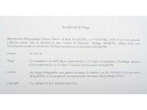 lithografie naar het werk van René Magritte 'La victoire’ uit 1939 - Voorzien van de droogsptempel van ADAGP en van de Succession Magritte alsook de paraf van Charly Herscovice