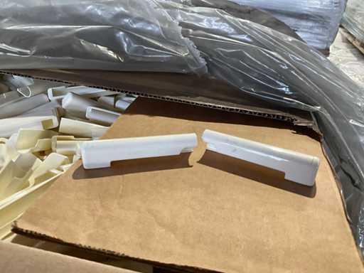 In kunststoffen uitvoering wit, telkens set L+R, 7,5 cm lang, per 1500 sets in doos, totaal 20 grote dozen op 1 pallet.