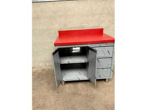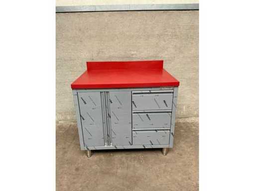 Rvs snijtafel met kunststof snijblad, 3 laden, 2 klapdeuren en 1 in hoogte verstelbaar schap