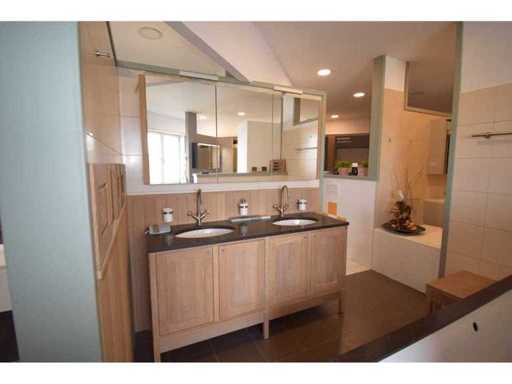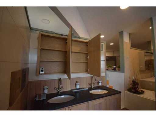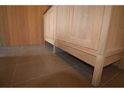 Prachtige massief eiken badkamermeubel, 4 draaideuren, massieve wastafel in blauwe hardsteen met 2 waskommen, spiegelkast met 3 triptic draaideurenen 2 LED verlichtingsarmaturen, excl kraanwerk en accesoires