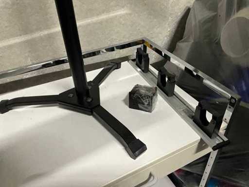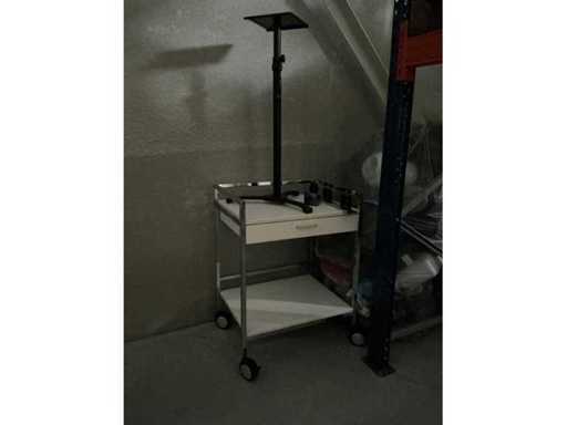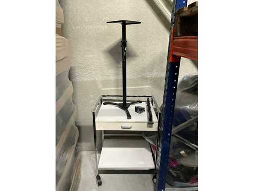 Compleet met verrijdbaar bijzetkastje, 7 dozen A4 papier Quantore waarvan 1 aangesproken, 3x metalen prullenmand, verrijdbare bijzettafel voorzien van 1 legger en 1 lade, compleet met telescopische staander Omnitronic