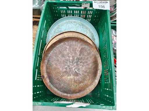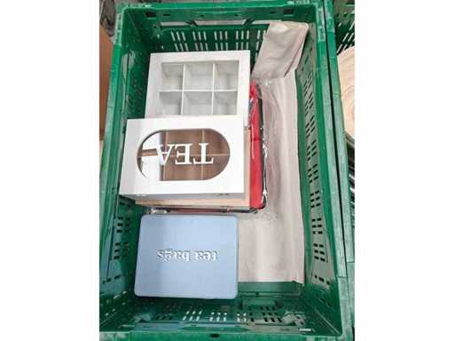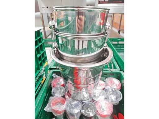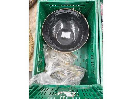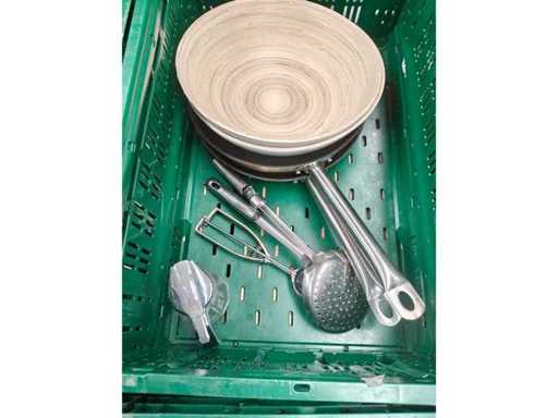 Pallet inhoudende 5 transportbakken met divers keukenmateriaal waaronder serveertangen, peper/zout vatjes, 3 inox ijsemmers, pannen, serveerschalen en theedozen