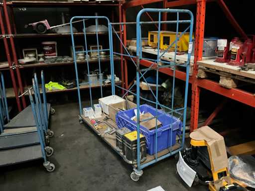 Bestaand uit driezijdig buizenframe gesloten kar met zwenkwielen, inhoud bestaande uit 4x pvc box met diverse inhoud