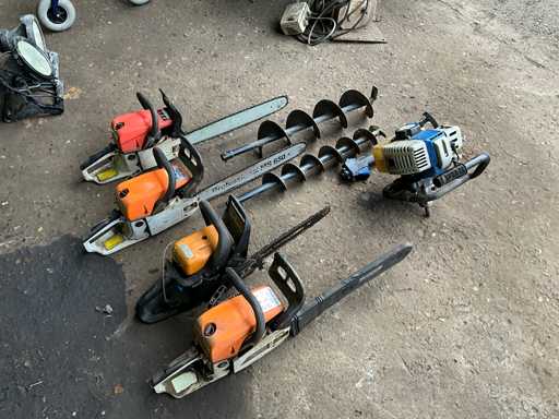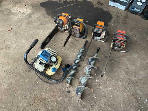 Lot met verschillende kettingzagen, grondboor, ... - Allemaal werkende maar hier en daar wat kleine zaken die missen of wat bijgesteld moeten worden, ze zijn niet nieuw maar wel gewoon functioneel