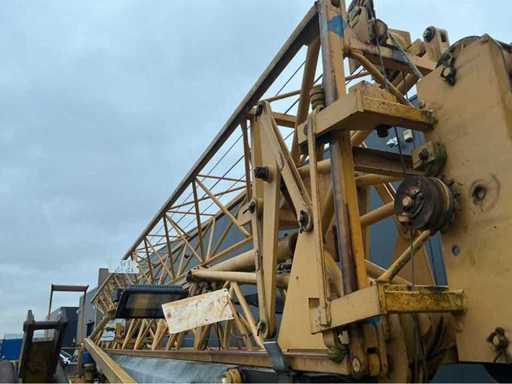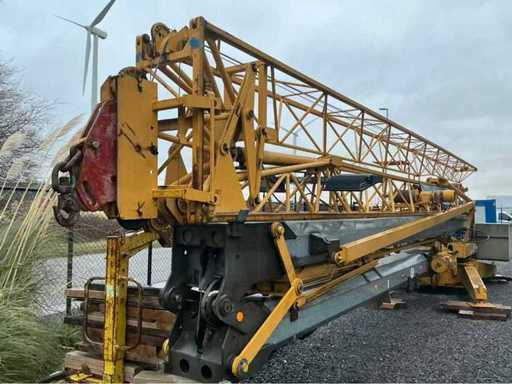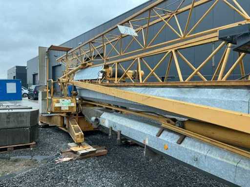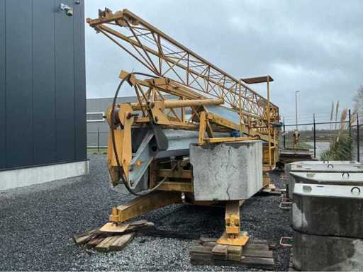 In functionele staat mobiele zelfoprichtende torenkraan met horizontale vakwerkgiek, uitgevoerd zonder wegtransportwielen en bedoeld voor opstelling op terrein of fundatie. Telkens gekeurd voor nieuwe opstelling werf. Fabrikant: niet met zekerheid vast te stellen (waarschijnlijk Duits/Frans)