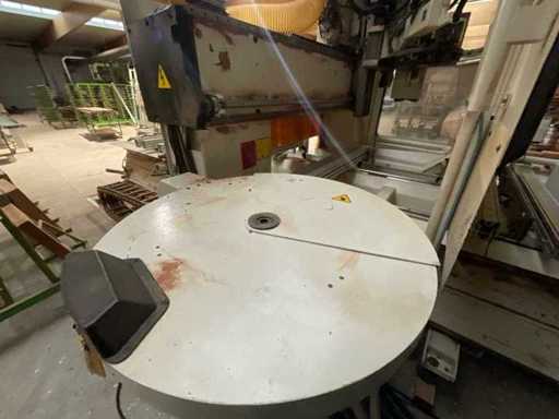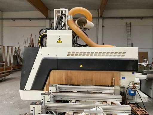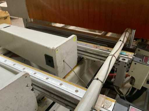 SCM merk houtbewerking CNC bewerkingscentrum, Record 142 TV-model, gebouwd in 2002 Fabrikantgegevens Fabrikant: SCM Group Model: Record 142 TV Bouwjaar: 2002 Serienummer: A01/01352 Voeding: 400 V – Driefasig – 50 Hz Geschatte gewicht: 5.800 kg Beschrijving CNC-machine voor de verwerking van houtpanelen en elementen en afgeleide materialen. 3 Assen De machine is uitgerust met een mobiele portaal, een omhulde bewerkingskop en een vacuümtafel met zuignapklemsysteem om de werkstukken tijdens het bewerken vast te houden. Aanwezigheid van een ingebouwd gereedschapsmagazijn (aantal en type gereedschap niet geverifieerd). De machine wordt geleverd met een aparte elektrische kast, een geïntegreerde bedieningsconsole en een transportband/uitvoertafel die ter plaatse zichtbaar is. Er is een verbinding voor zuigkracht. Zichtbare apparatuur CNC-vacuümtafel met zuignappen Mobiele portaalkraan Gefaired bewerkingskop Gereedschapsmagazijn Aparte elektrische kast Bedieningspaneel Transportband / uitvoertafel Beschermende omheiningen
