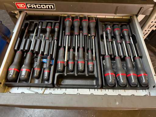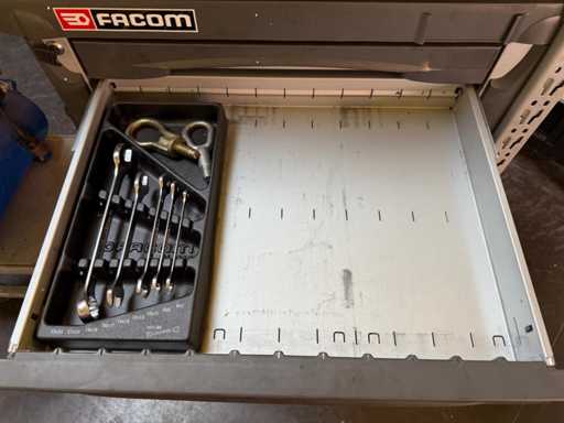 1x Werkbank met bankschroef, 1x rolwerkbank met compressor met verlengkabel en luchtslang op rol, 1x bandenrek, 2 x werkkist (Facom niet compleet andere wel volledig)