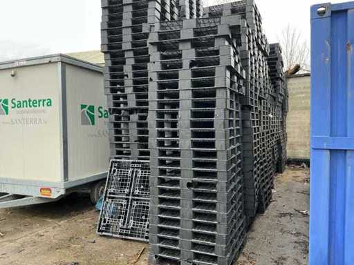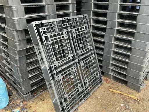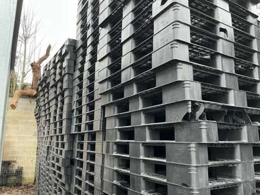 100cm op 120cm, schatting tussen de 400 en 450 stuks goede paletten en beschadigde door elkaar.