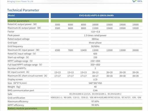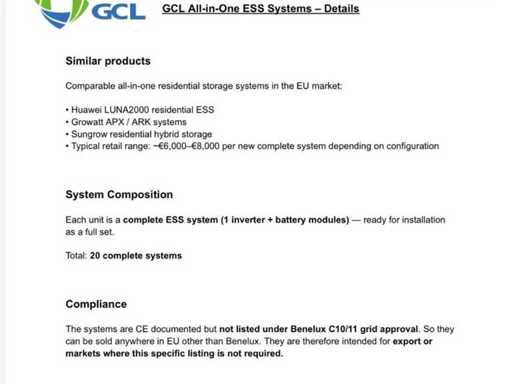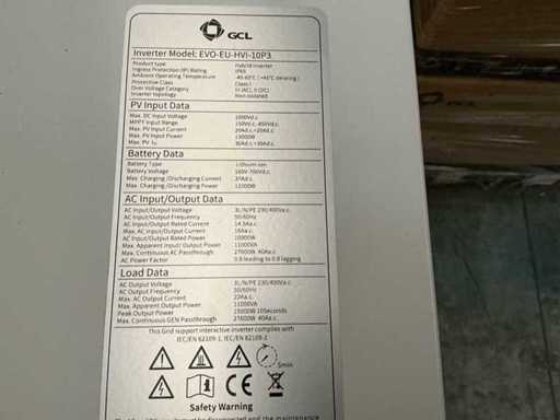 Professioneel GCL energieopslagsysteem bestaande uit een 3-fase hybride omvormer type EVO-EU-HVI-10P3 in combinatie met modulaire LiFePO4 hoogspanningsbatterijen type EVO-EU-HVP-4kWh. In totaal zijn 10 volledige en identieke units beschikbaar. Deze systemen zijn ontworpen voor residentiële en commerciële toepassingen waar betrouwbare energieopslag en slimme energiesturing centraal staan. De hybride omvormer ondersteunt zowel PV-input als netkoppeling en batterijopslag, waardoor optimale zelfconsumptie en back-upfunctionaliteit mogelijk zijn. Met een nominaal AC-vermogen van 10 kW per unit en een maximaal PV-ingangsvermogen van 13 kW biedt dit systeem krachtige prestaties binnen een compact en robuust ontwerp. De geïntegreerde LiFePO4-batterijmodules staan bekend om hun lange levensduur, hoge veiligheid en thermische stabiliteit. Elke module levert circa 4,09 kWh opslagcapaciteit en is geschikt voor intensieve laad- en ontlaadcycli. Dankzij IP65-classificatie zijn zowel omvormer als batterij geschikt voor binnen- en beschermde buitenopstelling. De units zijn voorzien van display met bedieningsinterface, statusindicatie en geïntegreerde WiFi-communicatie voor monitoring. De modulaire opbouw maakt schaalbare opslagconfiguraties mogelijk. Een hoogwaardige en toekomstgerichte energieoplossing, ideaal voor installateurs, projectontwikkelaars of bedrijven die inzetten op duurzame energie en energieonafhankelijkheid. Beschikbaar in partij van 10 complete systemen. Deze units zijn door een ontbrekend certificaat niet toegelaten voor gebruik in de Benelux. In andere landen zijn deze wel perfect bruikbaar.