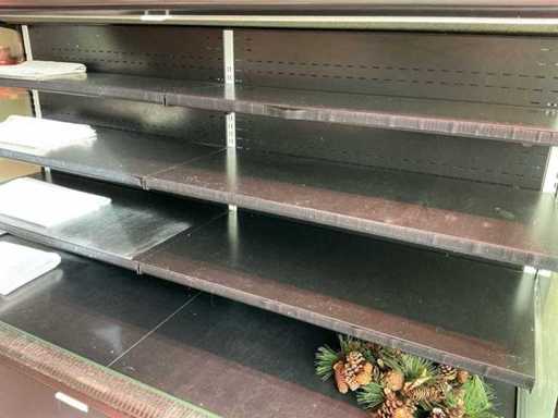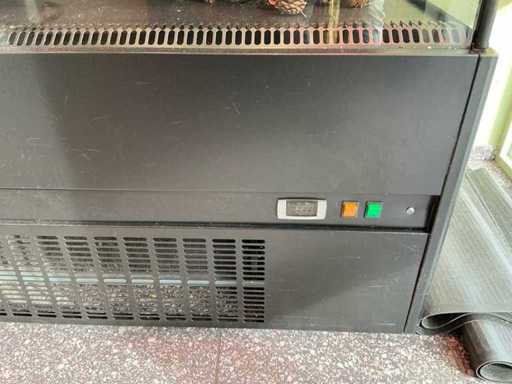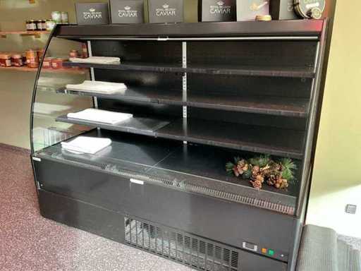 Professionele Mafirol wandkoelvitrine in zwarte uitvoering, geschikt voor gebruik in delicatessenzaken, traiteurs, slagerijen, bakkerijen of speciaalzaken. Dankzij het open front en de glazen zijpanelen worden producten optimaal gepresenteerd en blijft de zichtbaarheid maximaal voor klanten. De vitrine beschikt over meerdere verstelbare legniveaus, waardoor u de indeling flexibel kan aanpassen aan uw assortiment. De geïntegreerde ventilatiekoeling zorgt voor een gelijkmatige temperatuurverdeling over alle schappen. De temperatuur is regelbaar via een digitale thermostaat. De onderbouw bevat de geïntegreerde koelunit en ventilatie, wat zorgt voor een compacte en zelfstandige installatie zonder externe motorunit. De zwarte afwerking geeft een moderne en professionele uitstraling die in vrijwel elk interieur past. Geschikt voor presentatie van koude producten zoals kazen, charcuterie, desserts, dranken of andere gekoelde voedingswaren. Toestel vertoont normale gebruikssporen passend bij professioneel gebruik.