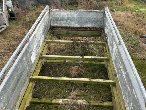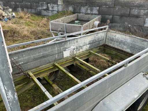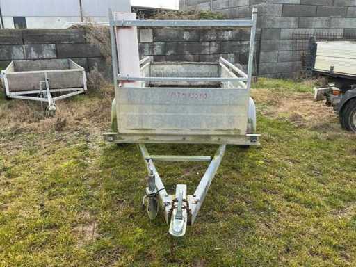 Dubbelas aanhangwagen – gegalvaniseerde uitvoering – max. 750 kg Degelijke dubbelas aanhangwagen in gegalvaniseerde uitvoering. Voorzien van neerklapbare/afneembare achterbord en stevige opbouw. Geschikt voor het transport van diverse materialen zoals bouwmaterialen, groenafval of machines. Afmetingen 2m60 op 1m28