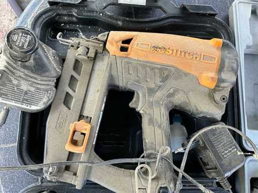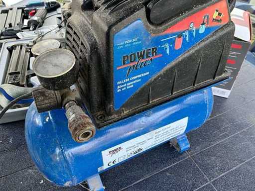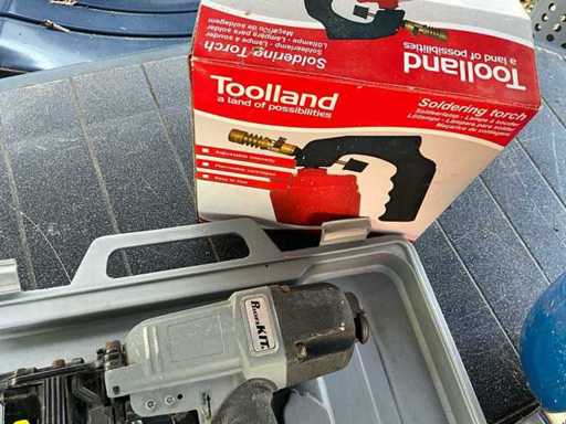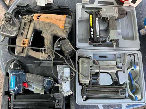lot bestaande uit 4 nagelpistolen (3x pneumatisch en 1 electrisch, inclusief batterij en lader) + 1 compressor + 1 soldeerlamp (ongebruikt in verpakking) - alle materialen zijn getest en werkend
